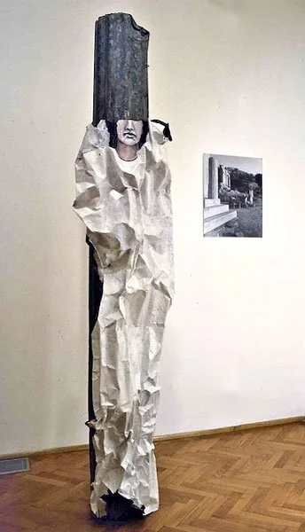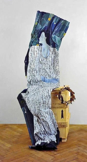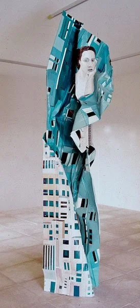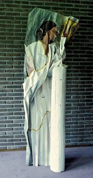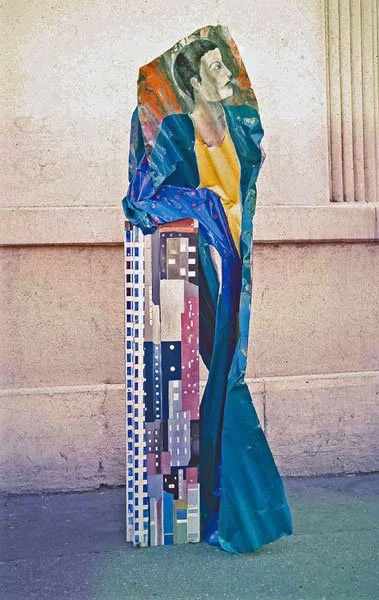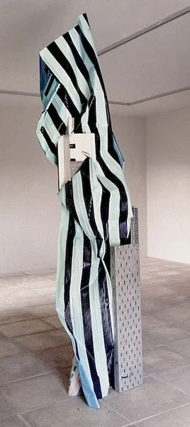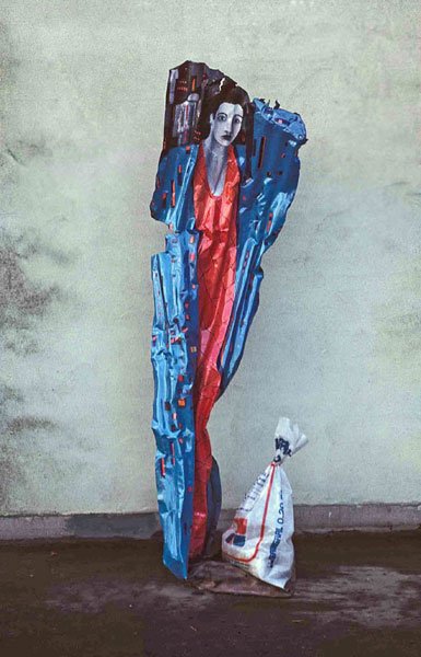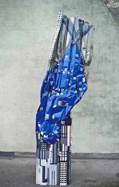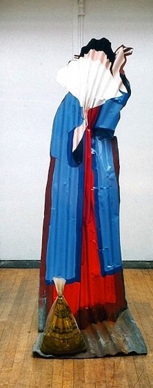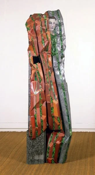 ...the material is concerned with the concrete expression of the idea's material foundation. Thus for the 'women series' Blacker used corrugated metal sheeting which had already been crumpled. In its deformed condition it paralleled a deformation which was taking place in patriarchical ideology, that is, the use of figures of women to represent or embody abstract ideas, an action which worked to the detriment of establishing a positive and holistic female imagery in the central tradition of Western art. Thus, while on occasion she uses traditional symbology, Blacker also reveals its negativity and decrepitude.