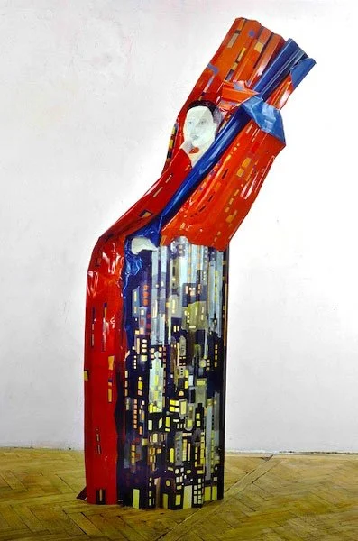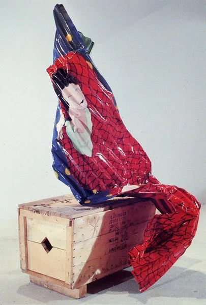 Pinning her hair with one hand, hiding her face with the other, the Japanese Geisha is the quintessence of femininity as men enjoy picturing it - demure, obedient, above all beautiful. With a start we are aware that this particular geisha is painted on an old piece of corrugated iron, distorted shapes resemble a robe, an arm, a fan - shapes the artist has highlighted to prove an obdurate material capable of previously unsuspected delicacy. Yet with a second flourish the trick is undermined; at her feet is a bag of clay, another building material waiting to be used. It is a study in extremes - the finish of the new, glossy paint transfiguring the fragment of scrap metal, feminine undulations countering masculine hardness, a disturbing play between two and three dimensions, the exotic and the everyday, between erotic invitation and unmannerly rebuttal.*